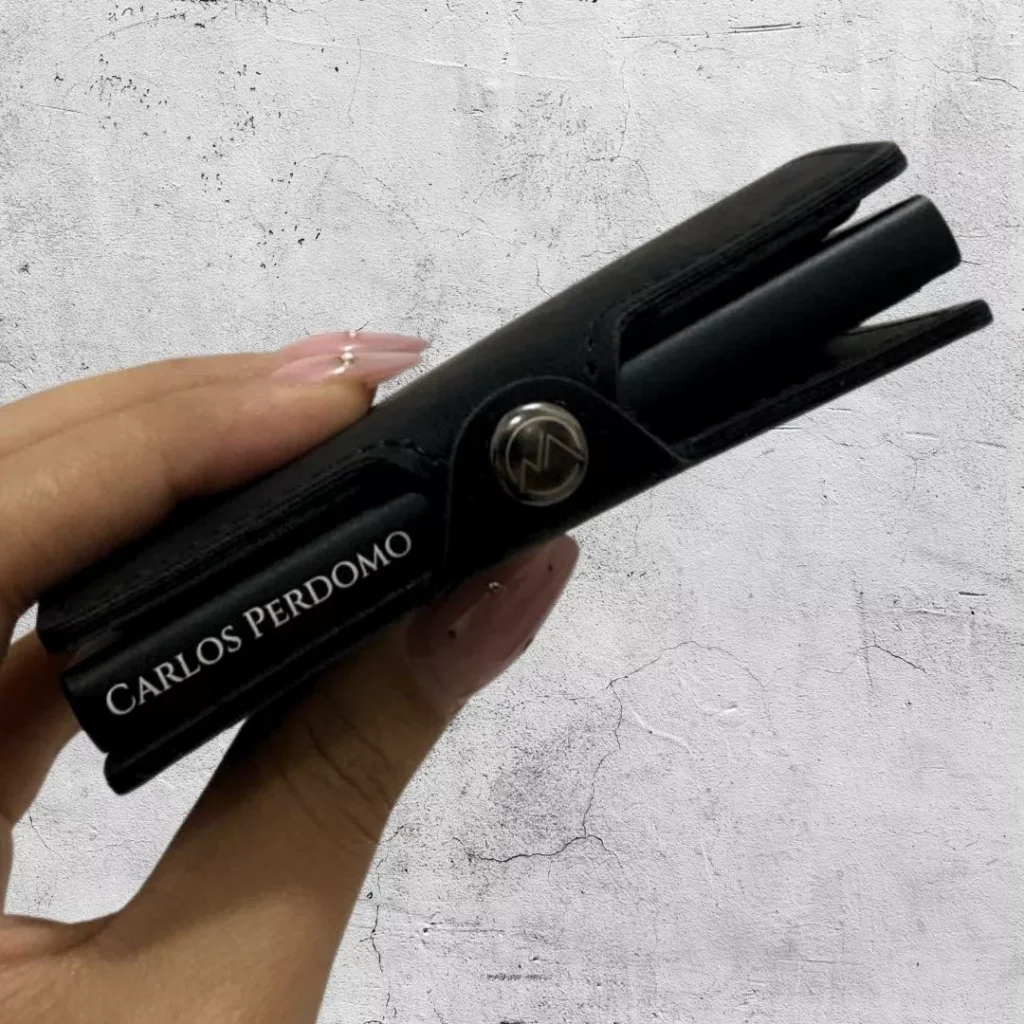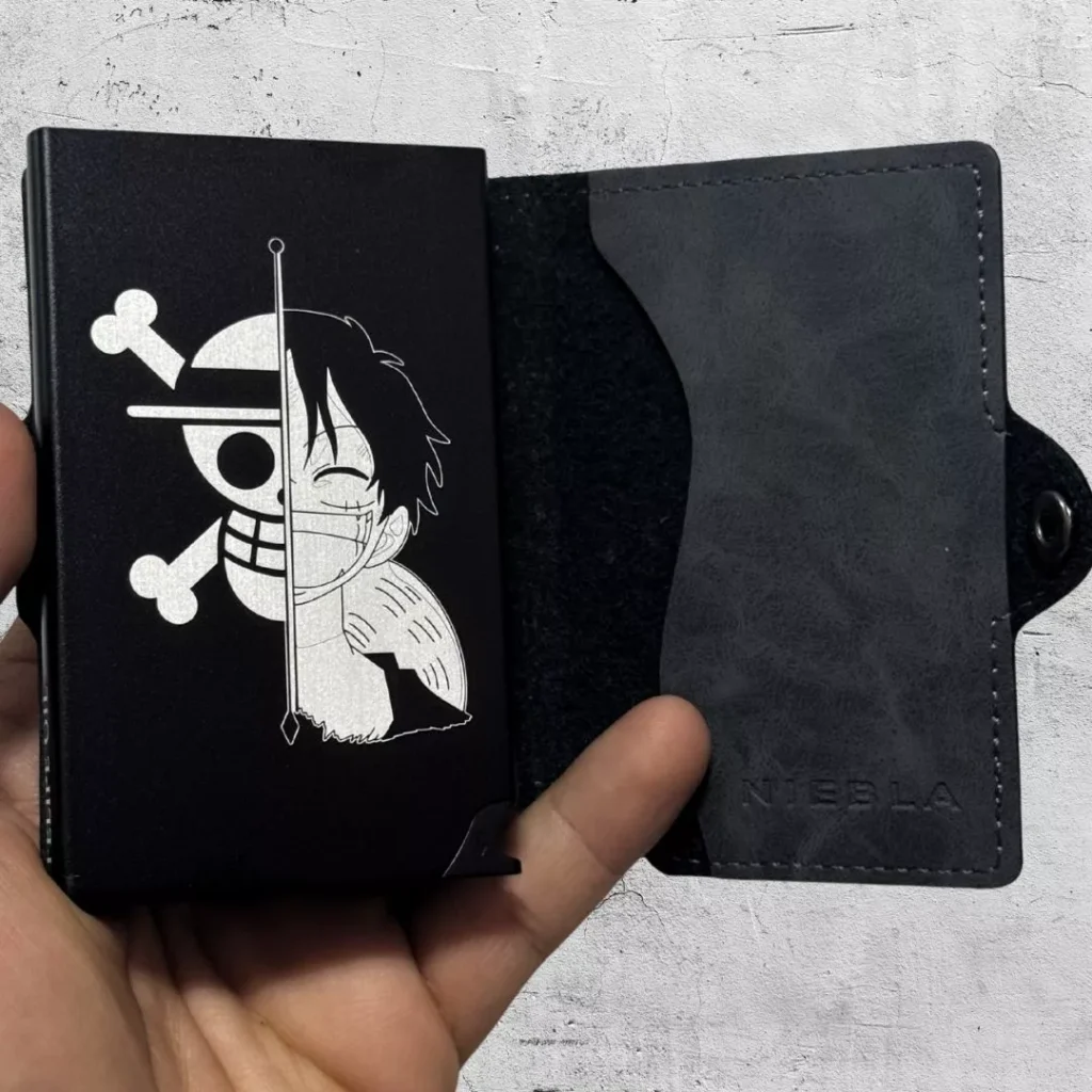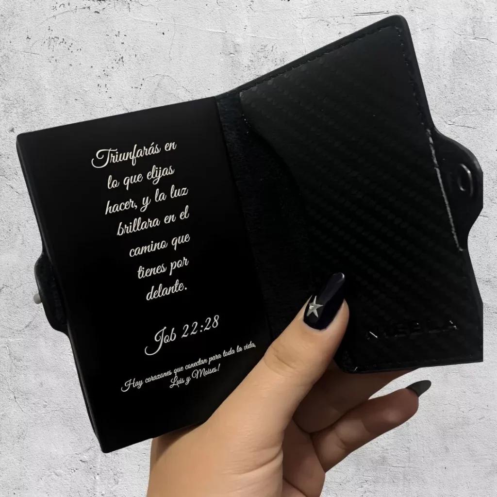 Adicionalmente, también es posible personalizar la parte metálica de las billeteras. Las personalizaciones se realizan a través de impresiones generadas en láser. Es posible realizar la personalización de textos e imágenes como logos, figuras e incluso algunas fotografías. Las personalizaciones en láser siempre se verán como una silueta de la imagen original, en un color.