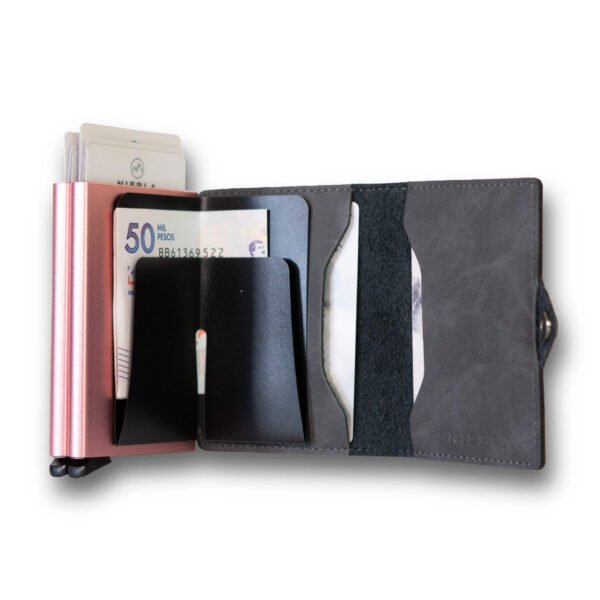 Las billeteras NIEBLA poseen sistema de protección RFID. Su característica principal es que poseen un compartimiento metálico fabricado en Aluminio, muy resistente y duradero. Esta carcasa metálica, diseñada para guardar principalmente tarjetas bancarias, previene el robo de datos personales a través de comunicaciones inhalámbricas. Su tamaño las hace billeteras muy cómodas de llevar y guardar en cualquier bolsillo.