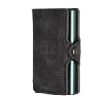 Nuestras billeteras Slim son ideales para aquellos que buscan un diseño elegante y minimalista con capacidad máxima para 12 tarjetas, y billetes. Además, cuentan con la tecnología RFID que protege hasta 6 de tus tarjetas de robos por medio de compras sin contacto no autorizadas. Estas billeteras están hechas con materiales de alta calidad, incluyendo cuero vegano y una parte metálica de titanio y aluminio para mayor durabilidad y resistencia.