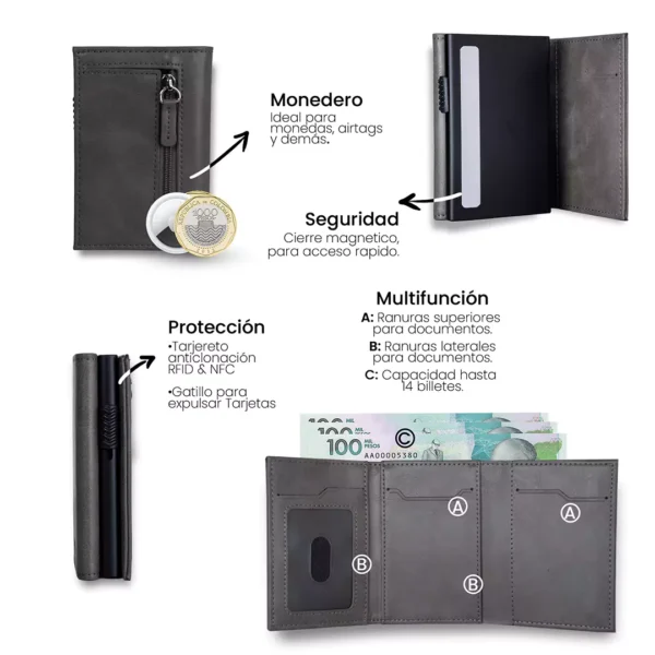 Elegancia y tecnología en tu bolsillo: cierre magnético, protección RFID, monedero, amplia capacidad y diseño premium. Compacta, segura y perfecta para tu día a día.