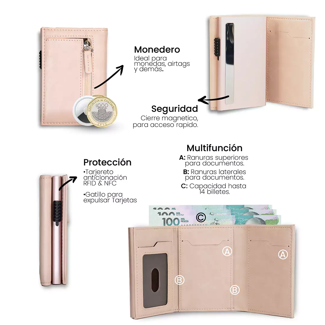 Elegancia y tecnología en tu bolsillo: cierre magnético, protección RFID, monedero, amplia capacidad y diseño premium. Compacta, segura y perfecta para tu día a día.