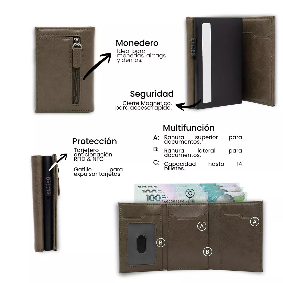 Elegancia y tecnología en tu bolsillo: cierre magnético, protección RFID, monedero, amplia capacidad y diseño premium. Compacta, segura y perfecta para tu día a día.