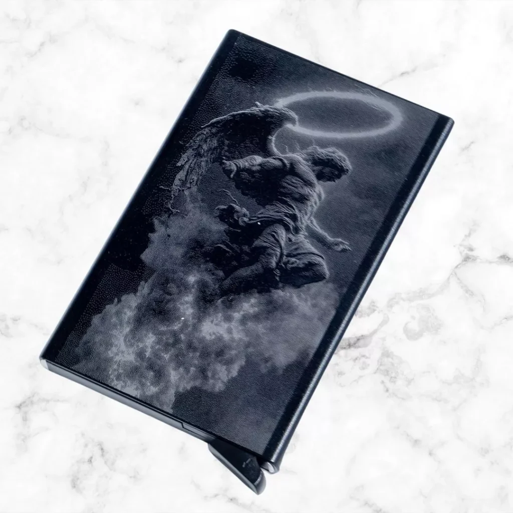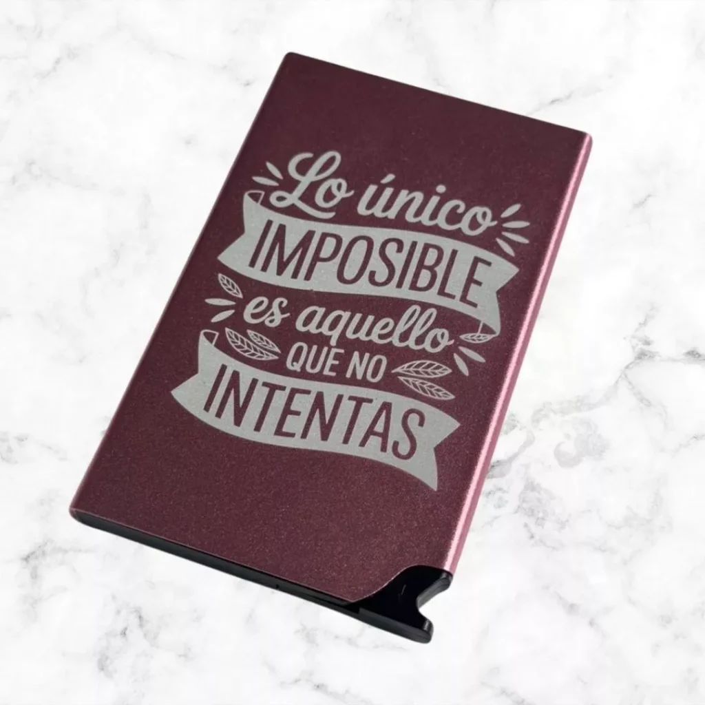 Adicionalmente, también es posible personalizar la parte metálica de las billeteras. Las personalizaciones se realizan a través de impresiones generadas en láser. Es posible realizar la personalización de textos e imágenes como logos, figuras e incluso algunas fotografías. Las personalizaciones en láser siempre se verán como una silueta de la imagen original, en un color.